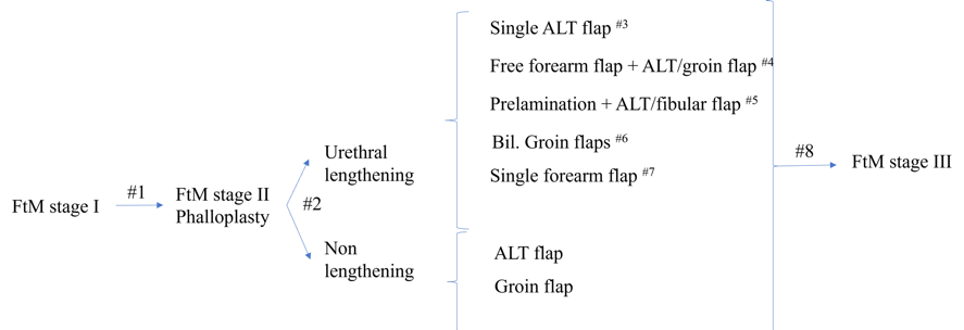 The current domestic practice of female-to-male gender affirming surgery requires the certifications from two different psychiatrists. Since the operation is irreversible, the oocytes may be reserved. The female-to-male gender affirming surgery is composed of three stages. The uterus and ovaries removed is firstly performed by the obstetrics and gynecology department. The second stage is performed by plastic surgery and urology for urethra lengthening and phalloplasty. The third stage is the prothesis insertion. The operation involves the anastomosis of nerves, blood vessels and urethra, thus, no smoking is suggested before and after the operation.