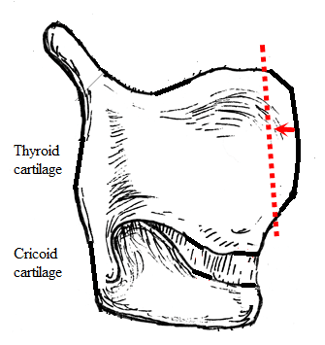 如圖所示,將左右兩側的甲狀軟骨切開後(如紅色虛線所示),前端突出的軟骨會因為聲帶的張力產生後拉(如紅色箭頭所示),因此降低聲帶張力,最終將兩側軟骨固定。