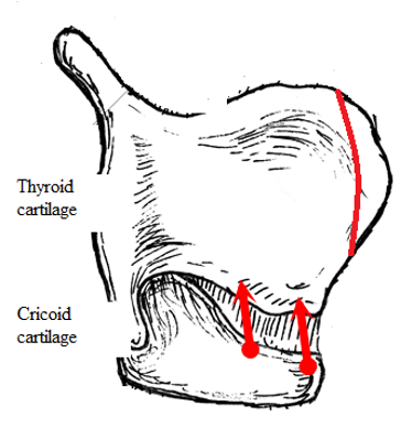 若同時想要柔化聲音,傷口則會移至甲狀軟骨及環狀軟骨(Cricoid cartilage)之間,將環狀軟骨往甲狀軟骨進行固定(如紅箭頭所示,Cricothyroid