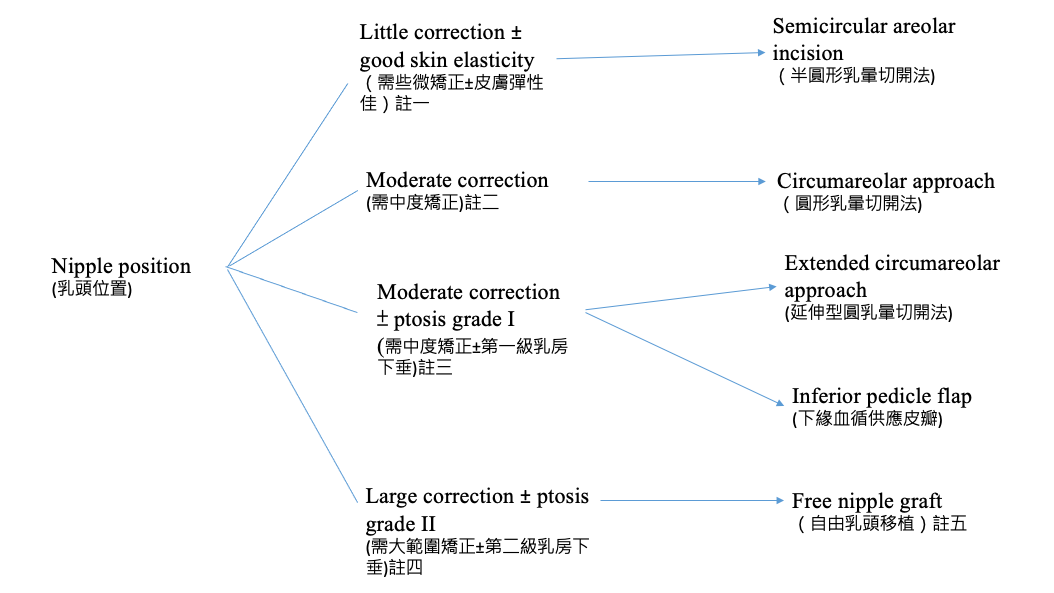 在進行手術前,根據患者的胸型及BMI值來評估手術後適當的乳頭的位置,下一步再根據需移動的距離、乳腺的多寡、皮膚的彈性及患者的傾向來選擇較佳的手術方式。